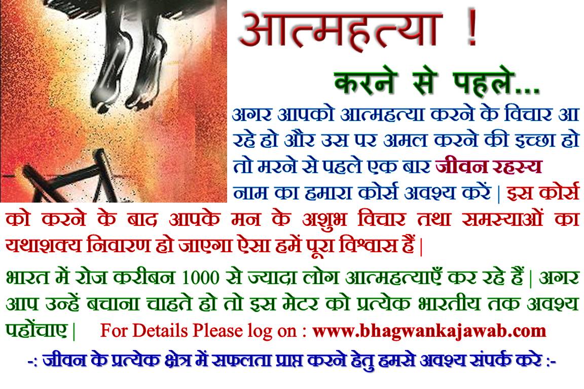 अगर आपको आत्महत्या करने के विचार आ रहे हो और उस पर अमल करने की इच्छा हो तो मरने से पहले एक बार जीवन रहस्य नाम का हमारा कोर्स अवश्य करें |